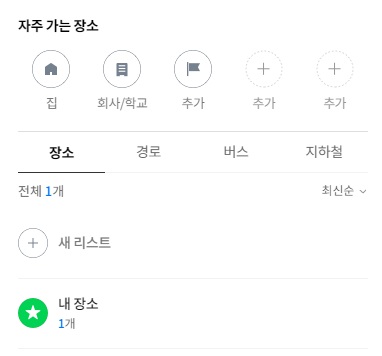 네이버 지도의 즐겨찾기 메뉴입니다. 해당 메뉴는 평소에 자주 이용하시는 위치들을 즐겨찾기 해놓는 기능입니다. PC보다는 모바일에서 더욱 유용할 기능인것 같습니다.