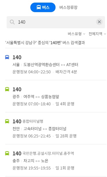 예를 들어 서울시의 140번 노선버스를 검색해 보겠습니다. 검색창에 140을 치면 전국의 모든 140번 버스가 나오는데 제가 확인해볼 버스는 서울시 버스이기 때문에 맨 처음에 위치해 있습니다.