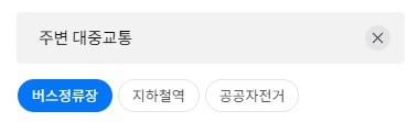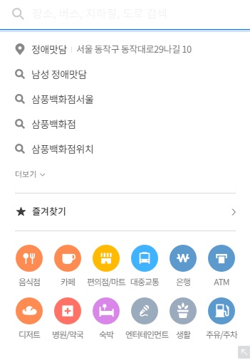 대중교통 간편검색기능입니다. 대중교통을 선택하시면 주변의 버스정류장과 지하철역을 우선으로 검색해서 알려줍니다. 버스정류장 위치를 찾을때 정말 편리합니다.(물론 모바일도 마찬가지입니다.)