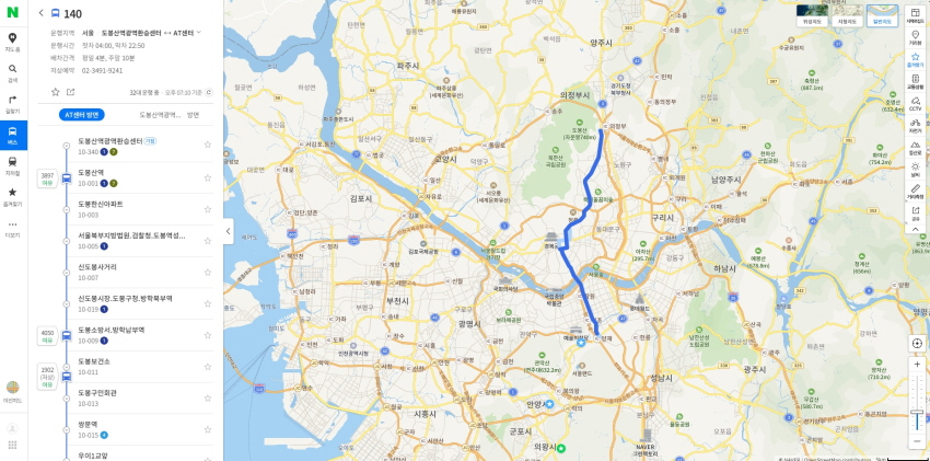 검색결과를 클릭해주면 서울시에서 운행하는 140번 버스의 전체 노선도를 한눈에 쉽게 확인이 가능합니다. 또한 좌측에서는 해당 노선의 버스정류장과 실시간 운행되는 버스위치를 확인하실 수가 있습니다.