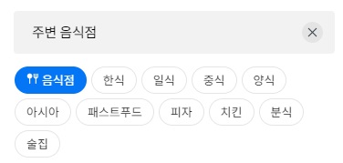 주변 음식점 검색에서 하위메뉴로 간편검색이 가능한 업종은 음식점, 한식, 일식, 중식, 양식, 아시아, 패스트푸드, 피자, 치킨, 분식, 술집 등이 있습니다. 네이버 지도에서 간편하게 검색해보세요.