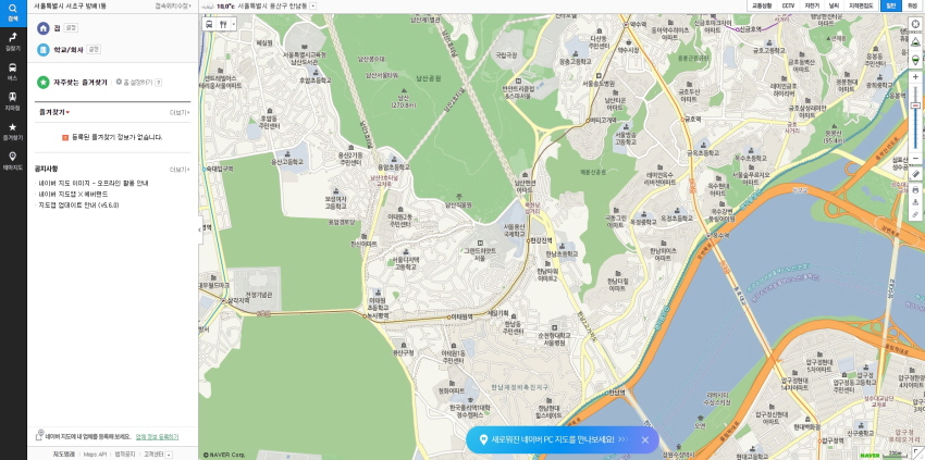 네이버 지도의 메인화면입니다. 예전보다 지도가 더욱 부드러워졌다고나 할까요? 아무튼 색감이나 표현 이런것들이 변경된것이 느껴집니다. 좌측에는 다양한 메뉴들이 있는데요. 지도 홈, 검색, 길찾기, 버스, 지하철, 즐겨찾기 등이 있습니다.