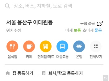 네이버 지도 홈 메뉴는 네이버 지도 접속시 가장 먼저 보실수 있는 화면입니다. 좌측 상단에 간편하게 자주검색하는 메뉴들을 표현해주었는데요. 접속한 위치화 함께 날씨 정보도 제공해주고 있습니다. 간편 검색 메뉴로는 음식점, 카페, 편의점/마트, 대중교통, 은행 등이 있습니다.